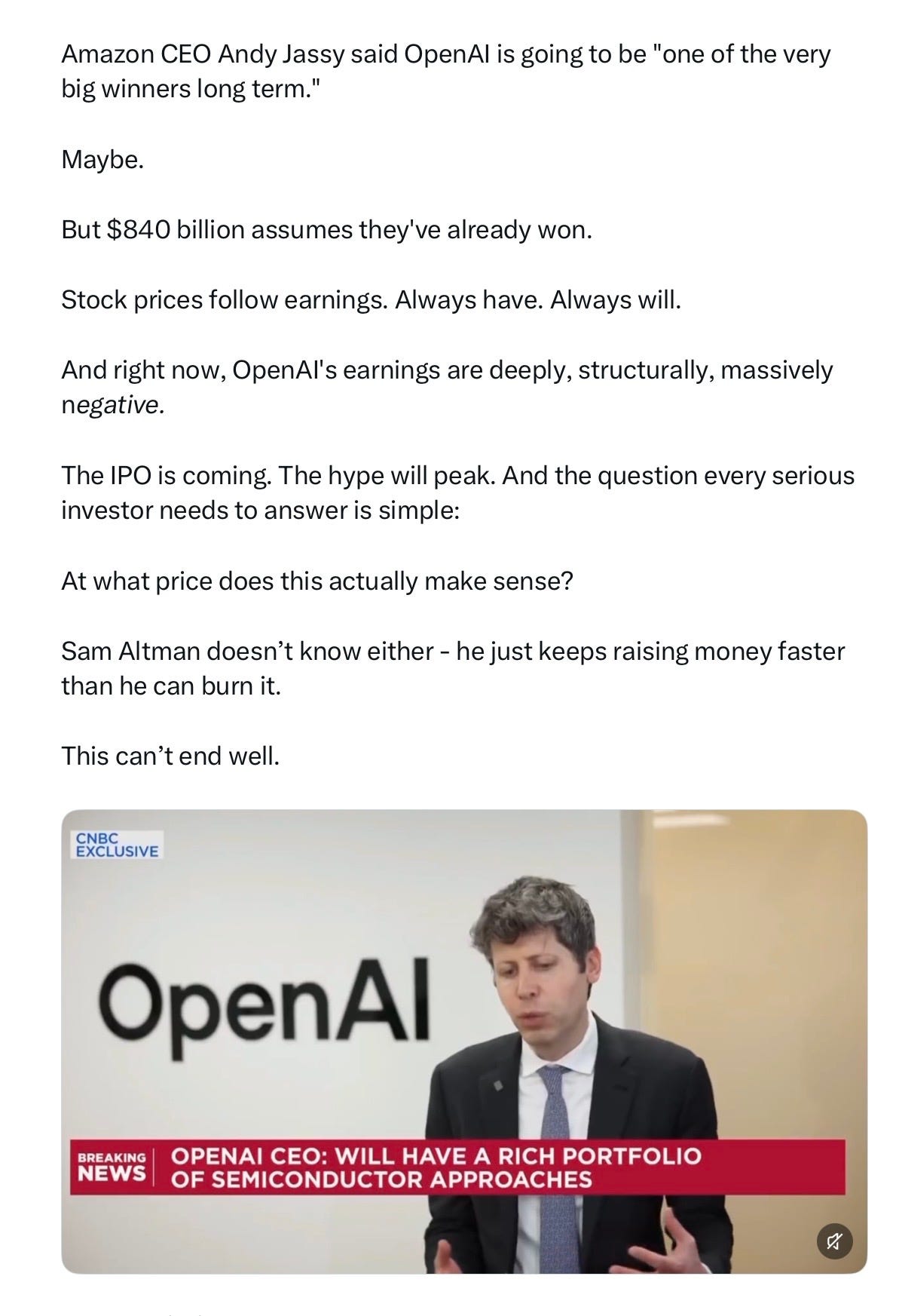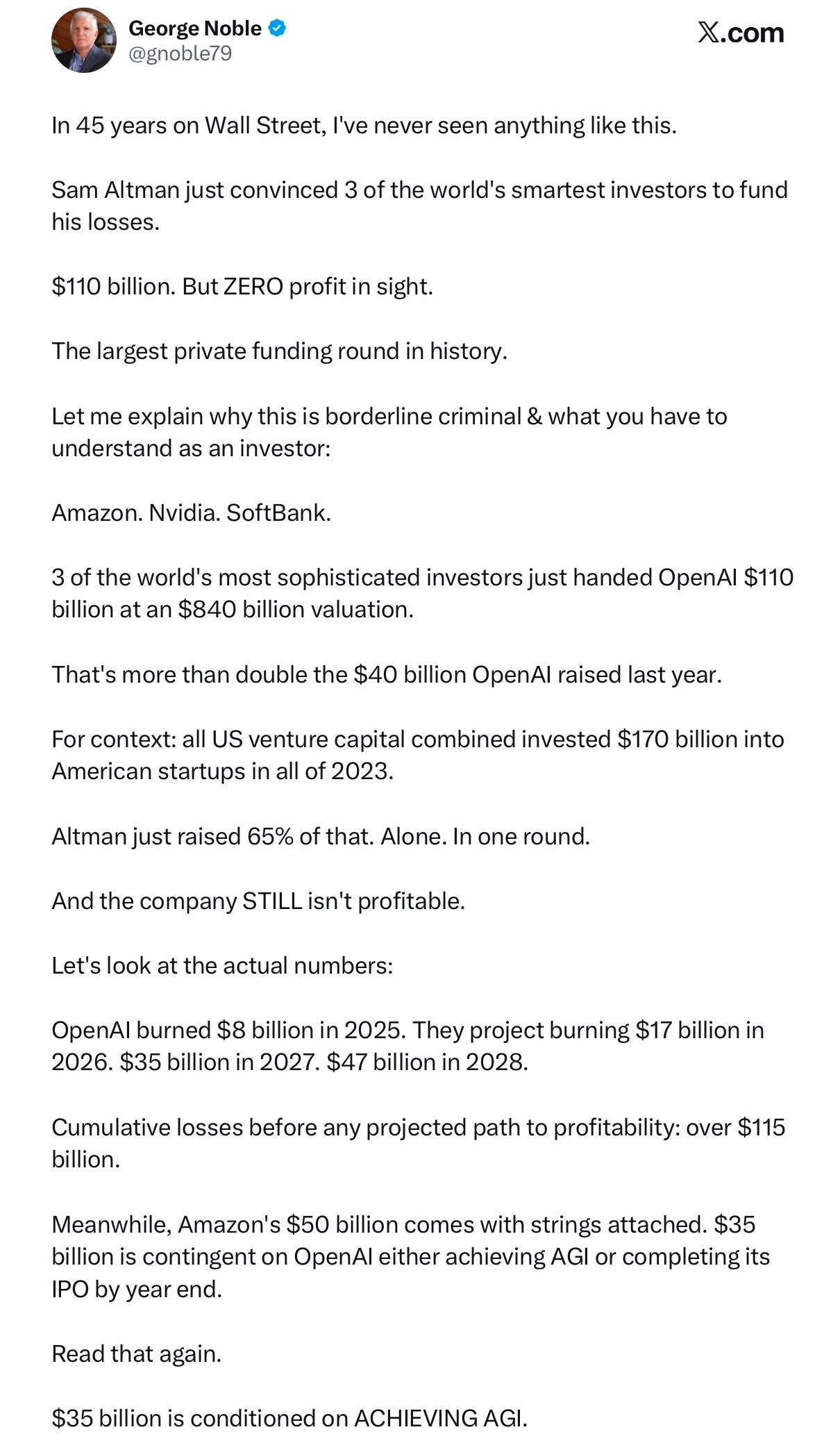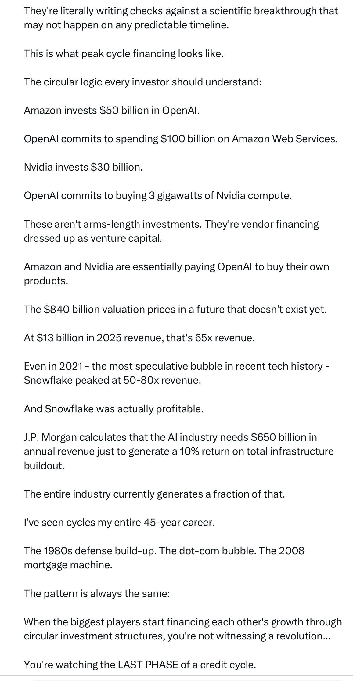 “These aren’t arms-length investments. They’re vendor financing dressed up as venture capital.” 65% of all venture capital in one round, to one company that has never made a profit (with no immediate hopes of doing so), and no clear technical advantage. What were they thinking?!