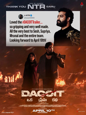 Jr. NTR felt the trailer was gripping and well-made, extending his best wishes to the team. Dacoit is already surrounded by positive vibes, and this push from stars will only benefit the film, produced by Supriya Yarlagadda.